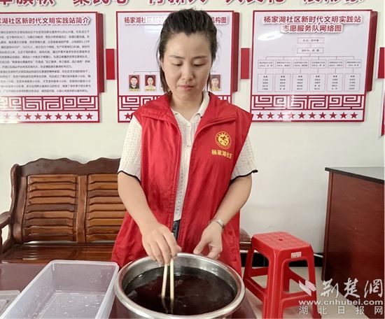 活動(dòng)開始前,社區(qū)網(wǎng)格員準(zhǔn)備好冰塊、水杯,著手將配置好的酸梅湯燒制起來,并清洗好鍋盆、綠豆,加入冰糖,慢慢熬燉“愛心綠豆湯”。
