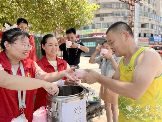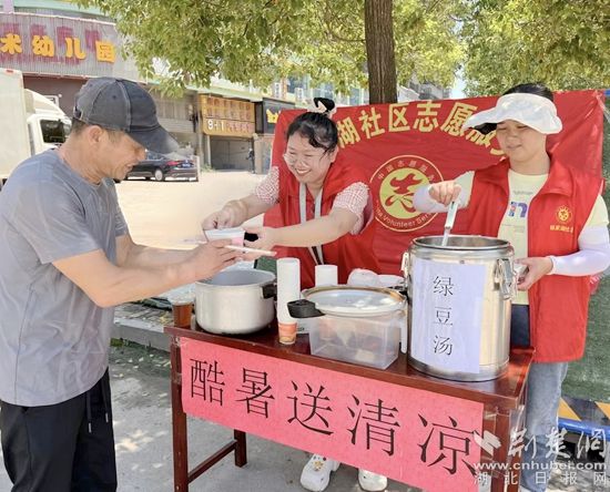 活動(dòng)現(xiàn)場,社區(qū)工作人員在菜市場路口提前設(shè)置好清涼桌,將準(zhǔn)備好兩大桶的綠豆湯和涼茶,發(fā)放給高溫下的工作者和路過的居民。同時(shí),為他們科普防暑降溫知識,叮囑他們注意休息和避暑。