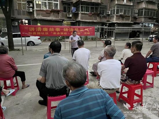 傍晚時(shí)分,身處湖濱花園小區(qū)的“和悠然 慢生活”休閑廣場(chǎng),第二黨支部書記呂培根分享了《留得清氣滿乾坤》廉潔故事匯中的周恩來(lái)廉潔自律的故事。他勸誡領(lǐng)導(dǎo)干部們,要想成功度過(guò)思想、政治、社會(huì)、親屬和生活的五道關(guān)口,就必須堅(jiān)守共產(chǎn)黨員的政治操守和優(yōu)良作風(fēng)。