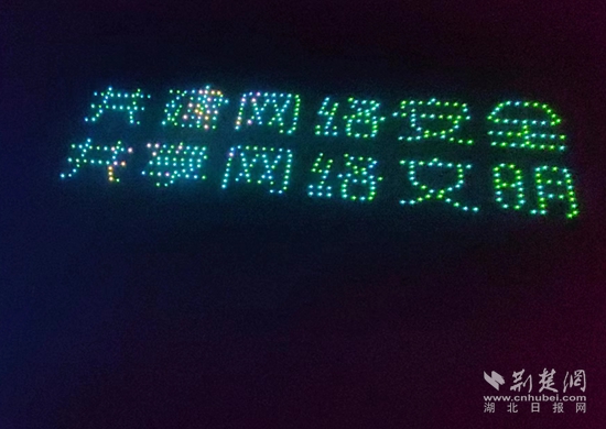 夜空中,數(shù)百架無人機以天空為畫布、以光影為畫筆,描繪出一幅幅科技與視覺的“大片”。表演融入網(wǎng)絡(luò)視聽元素和黃石、湖北地標(biāo)內(nèi)容,依次幻化成小燕子、天空之城、黃石歡迎你、地球、安全盾牌等11個畫面,最終匯集成“共建網(wǎng)絡(luò)安全 共享網(wǎng)絡(luò)文明”的字樣。
