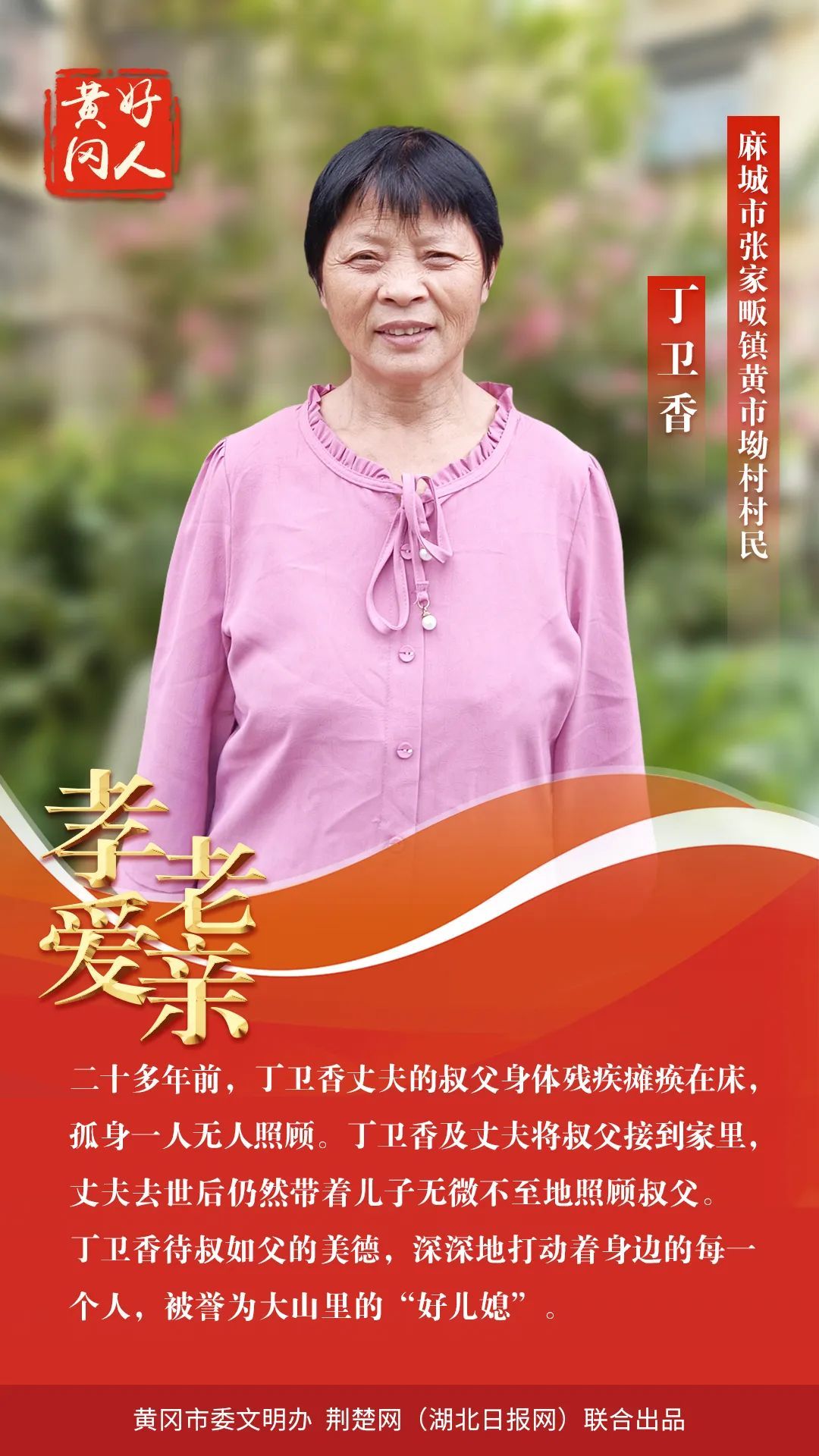 本期“黃岡好人”共有5組好人入選。他們中,有“見義勇為,勇救落水者”的秦遵照;有“扎根基層七十余載老醫(yī)”的張自強;有“孝老愛親,待叔如父,被譽為大山里‘好兒媳’”的丁衛(wèi)香;有“助人為樂,從事志愿服務30余年的”的汪天明;有“助人為樂,創(chuàng)建了‘向陽花’留守兒童之家品牌”的張靜。