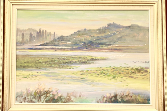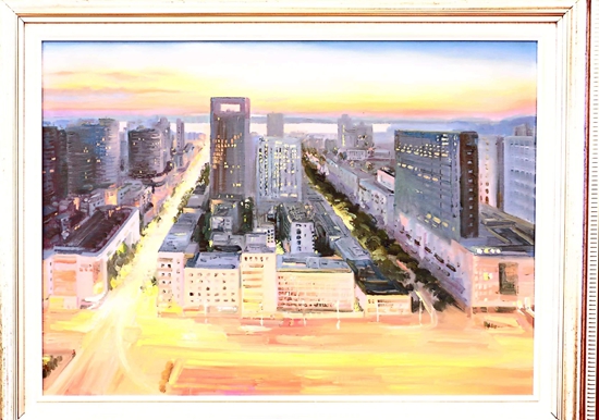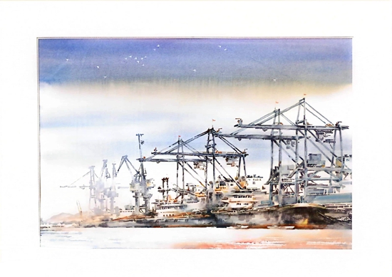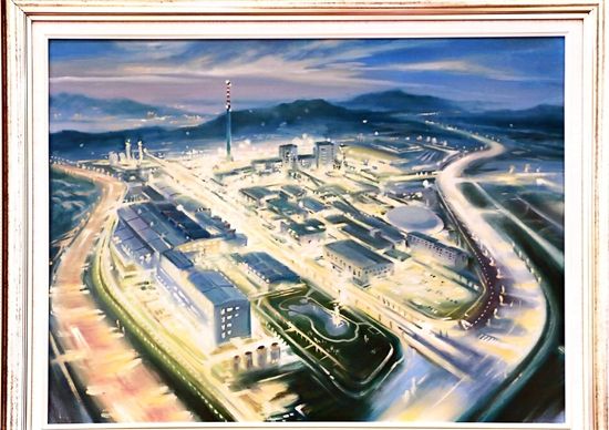 第一幅畫,展示的是數(shù)只船舶在新港碼頭裝卸貨物的繁華景象。第二幅畫,卡車進(jìn)入棋盤洲綜合保稅區(qū)外卡口的實(shí)景記錄。第三幅畫,描繪的是園區(qū)夜間工廠燈火通明、24小時(shí)生產(chǎn)不停的場(chǎng)景。第四幅畫,以綠色為底色,展示的是人與自然和諧共生的美景。第五幅畫,描繪的是棠梨湖商業(yè)街的街景。