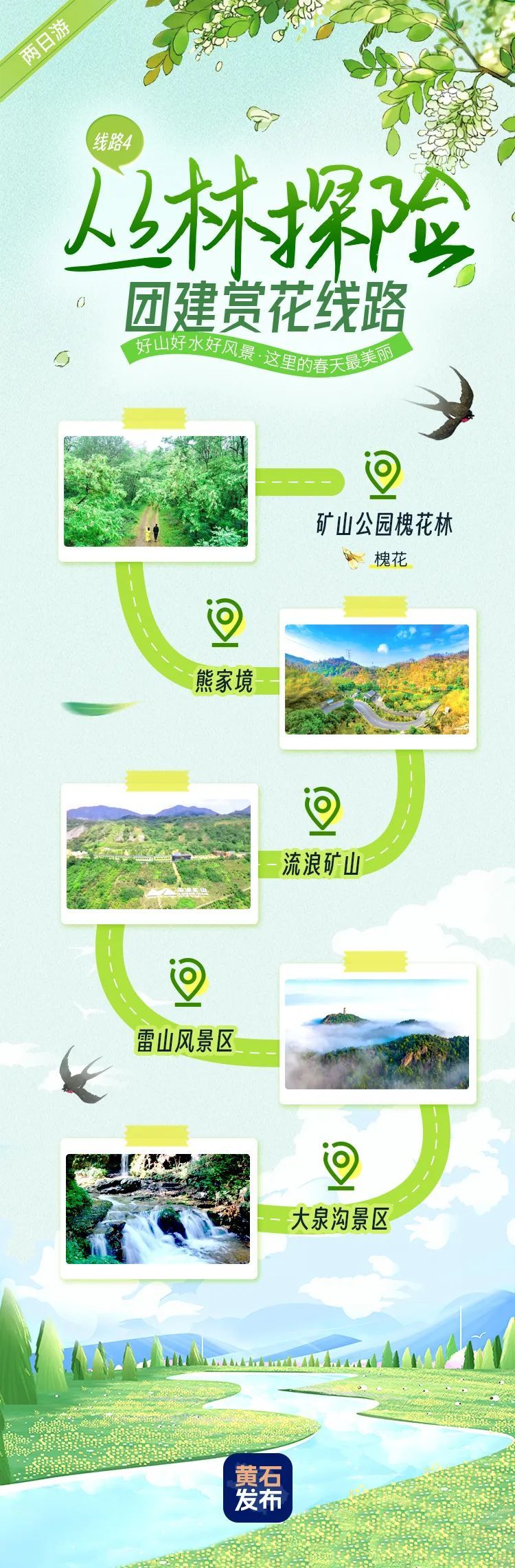 礦山公園槐花林-熊家境-流浪礦山-雷山風景區(qū)-大泉溝景區(qū)。