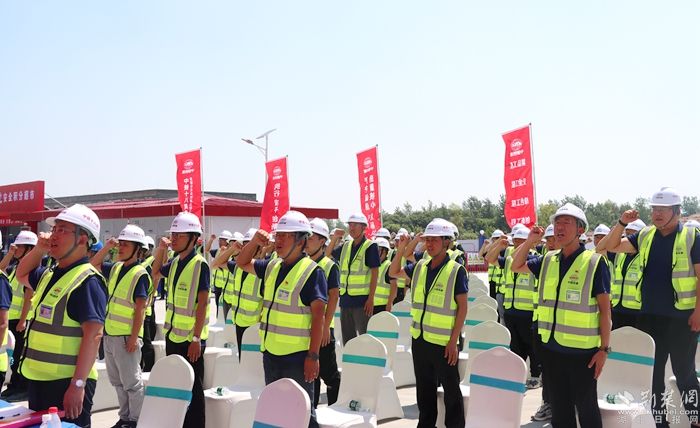 “我是一名光榮的建設者,面對鮮紅旗幟,莊嚴宣誓: 快速制勝,安全至上,只爭朝夕創(chuàng)高產(chǎn);精細管理 創(chuàng)譽創(chuàng)效,銳意進取提質(zhì)效;勇當標桿,建造精品,實干興企爭一流。我鄭重承諾……堅決做到……”建設者們的眼中閃爍著堅定的光芒,現(xiàn)場的氣氛被這一番誓言推向了高潮。