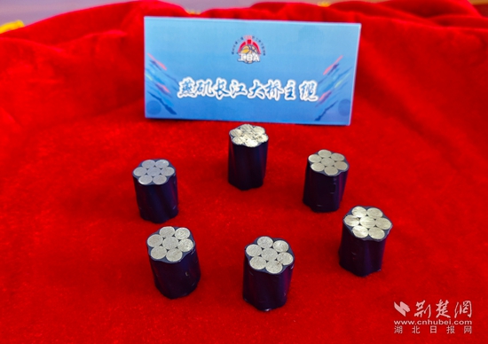 燕磯長(zhǎng)江大橋的項(xiàng)目書記、工會(huì)主席喻林峰介紹,這6根鋼索來(lái)自燕磯長(zhǎng)江大橋的主纜,它是2100兆帕的高強(qiáng)鋼索。燕磯長(zhǎng)江大橋是世界最大跨徑四主纜懸索橋,同時(shí)也是世界首座不同垂度四主纜雙層鋼桁梁懸索橋。大橋一共有四根主纜,每根主纜有217根索股,每根索股由127根如此次捐贈(zèng)的鋼索構(gòu)成。