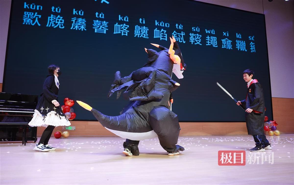 704班學(xué)生演了一出《達(dá)拉崩吧》話劇,騎士、公主、國王、恐龍、馬的服裝是他們定的,炫酷搞笑的視頻布景也是他們做的?!拔覐男⊥婢幊蹋@個還好啦,演恐龍的寇樂芊也有幫我剪視頻?!逼渲猩砑鎸?dǎo)演、舞美設(shè)計、騎士扮演者三職的劉致銘說?!拔野嗪⒆友荨妒刈o(hù)之光》小品,就找劇本我?guī)土它c(diǎn)忙,其他都是他們自己安排。上周五全校彩排我第一次看完全劇,發(fā)現(xiàn)他們好有創(chuàng)意,好會演?!?05班班主任徐怡楠驕傲地說,每次活動都發(fā)現(xiàn)許多學(xué)生的閃光點(diǎn),正如“走過冬天”藝術(shù)節(jié)的slogan(口號)所說,在活動中,青春多了一份厚實(shí),人生多了一份財富。