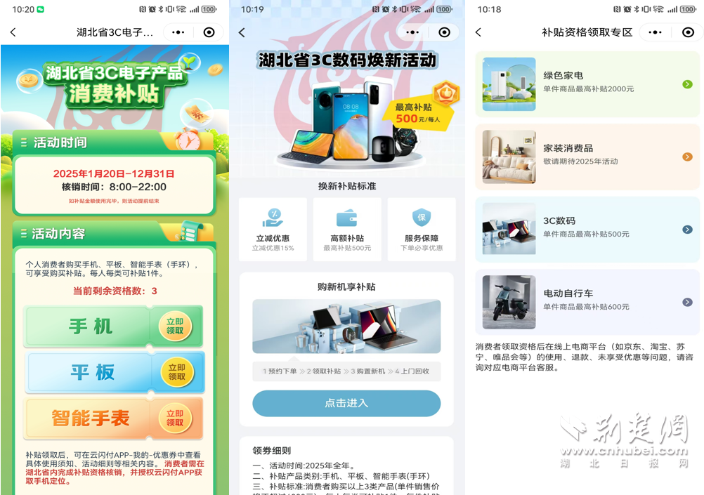 荊楚網(wǎng)(湖北日報網(wǎng))訊 (通訊員 高洋)2025年1月20日,“國補”政策首次擴圍至消費電子行業(yè)。對個人消費者購買華為手機、平板、智能手表手環(huán)等3類數(shù)碼產(chǎn)品(單件銷售價格不超過6000元),按產(chǎn)品銷售價格的15%給予補貼,每位消費者每類產(chǎn)品可補貼1件,每件補貼不超過500元。對于想要購買華為手機的消費者來說,這波優(yōu)惠力度拉滿。