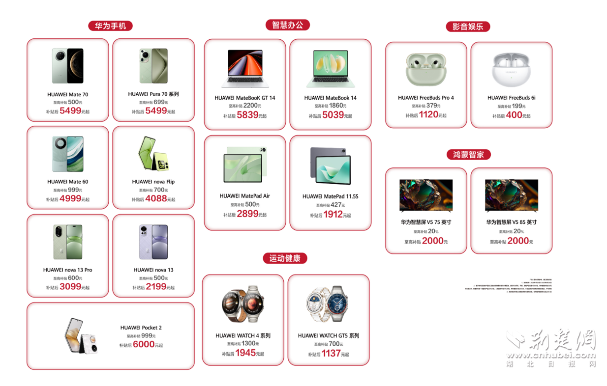 在此基礎(chǔ)優(yōu)惠下,即日起到店購買部分華為手機、平板、穿戴產(chǎn)品,至高補貼15%,單件最高補貼500元;華為筆記本、智慧屏至高補貼20%,單件最高補貼2000元!到店可疊加更多優(yōu)惠活動,歡迎來湖北華為門店咨詢選購!