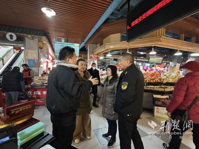 嚴(yán)密開展農(nóng)貿(mào)市場“優(yōu)秩序保安全迎新年”專項(xiàng)督查行動,分管領(lǐng)導(dǎo)帶隊(duì)檢查了東湖景園市場,重點(diǎn)檢查了市場內(nèi)外環(huán)境衛(wèi)生、長江漢江魚禁售、計量電子秤、保供穩(wěn)價、消防安全等情況。