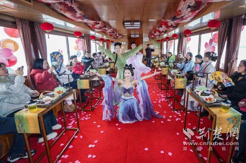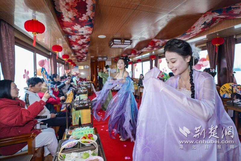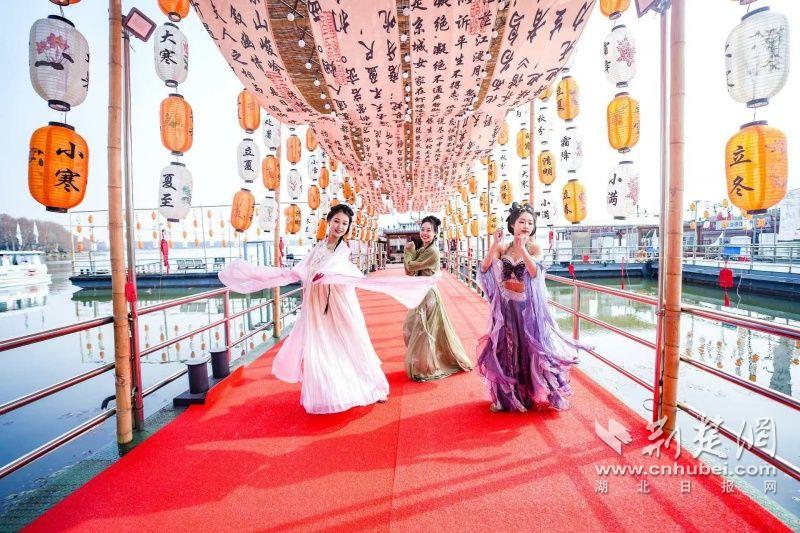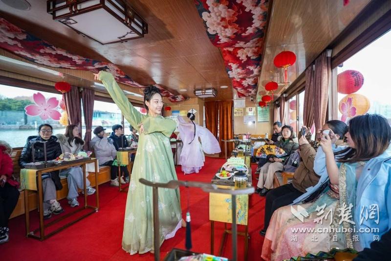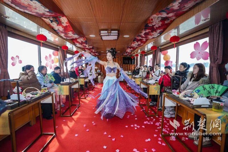 據(jù)介紹,全新上線(xiàn)的精品環(huán)湖游將為游客帶來(lái)沉浸式國(guó)風(fēng)演藝體驗(yàn),從楚風(fēng)園碼頭出發(fā),在游客登船之際,精彩好戲就已正式開(kāi)鑼。畫(huà)舫離岸,演出開(kāi)始,《元夕》《一面驚鴻》《錦瑟》等國(guó)風(fēng)舞蹈亮相甲板,表演者們霓裳蹁躚,或婉約柔美,或英氣颯爽,在游客面前隨著悠揚(yáng)楚樂(lè),將楚舞的神韻演繹得絲絲入扣,不時(shí)還與游客隨機(jī)互動(dòng),同賀新春。