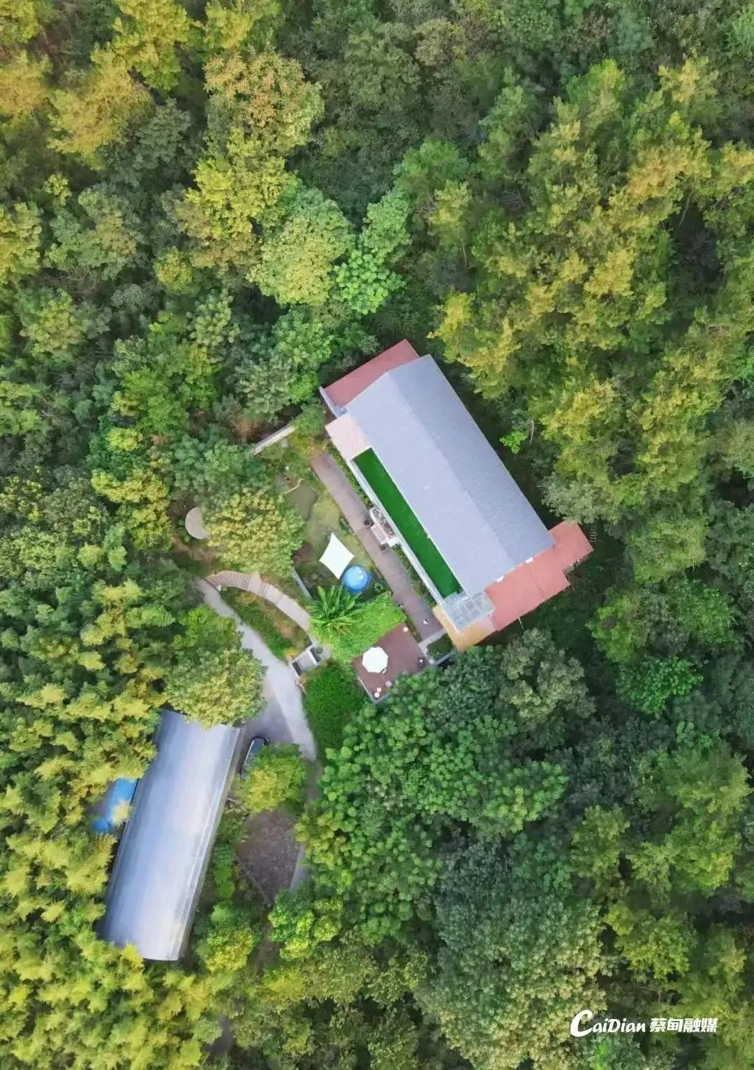 九真山腳下,隱匿在竹海森林之中,私密而小眾。民宿建筑取意“花開(kāi)有時(shí),知音難覓”——主樓如綻放的夏花般舒展,庭院中蜿蜒的水系暗合“高山流水”的韻律。