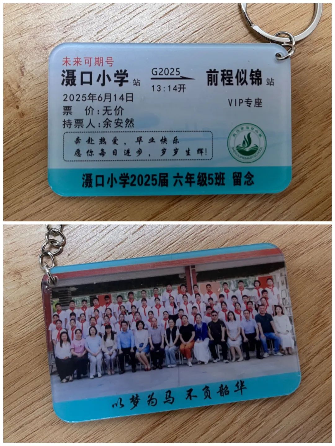 這張“火車票”不簡單,是獨(dú)一無二的定制款!這趟車叫“未來可期號”,車次是G2025,從“灄口小學(xué)”站開往“前程似錦”站。發(fā)車時(shí)間特意定在6月14日13時(shí)14分,這是孩子們在校的最后一天,意義非凡!每張票上都印著?;?,持票人是孩子們的名字。票價(jià)那一欄寫著“無價(jià)”,座位更是“VIP專座”,滿滿都是我對他們的愛和期許!