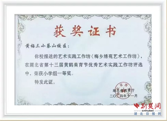 “讓孩子們從小學(xué)習(xí)挑花技藝,不能讓傳統(tǒng)技藝失傳,同時通過挑花活動培養(yǎng)孩子們靜下心來專注做事的良好品質(zhì)?!蓖趺粽f。2024年秋,學(xué)校“梅鄉(xiāng)繡苑”挑花工作坊帶著師生挑繡的作品參加湖北省第十三屆黃鶴美育節(jié),榮獲藝術(shù)實踐工作坊一等獎。