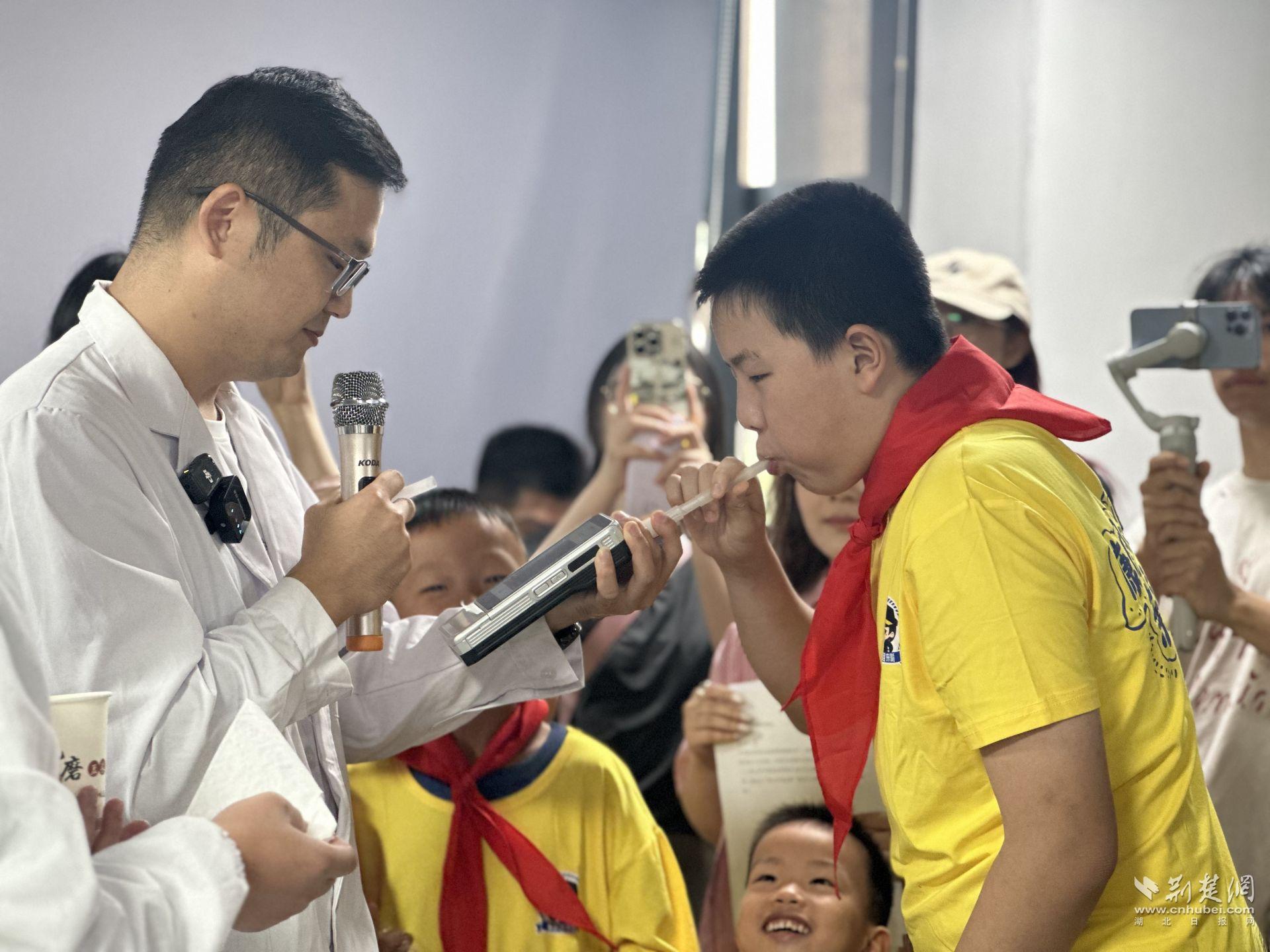吃蛋黃派會被算酒駕嗎?在理化實驗室,艾翔、李博文老師通過現(xiàn)場檢測食用前后的呼氣酒精含量,向家長和孩子揭示腐乳、格瓦斯等含酒精食品的 “隱形風(fēng)險”。