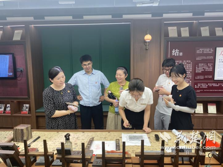 在工作人員的講解中,黨員干部們深入了解了書(shū)店背后的故事,并親手參與了館內(nèi)拓印等非遺體驗(yàn)項(xiàng)目。手掌與墨拓相遇的瞬間,大家仿佛穿越回那個(gè)戰(zhàn)火紛飛的年代,更直觀地感受到革命文化工作者的堅(jiān)守與智慧。