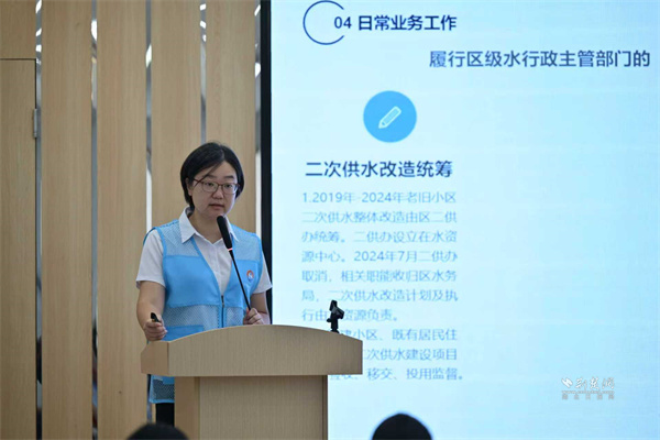 活動開場,武昌區(qū)水資源管理服務(wù)中心主任周妍圍繞《武昌區(qū)水務(wù)和湖泊局及水資源管理中心工作職責(zé)》展開解讀,清晰梳理水務(wù)部門在水資源調(diào)配、供水保障、設(shè)施維護等方面的職能;同時深入講解二次供水改造及修繕現(xiàn)行政策,從改造標準、申請流程到惠民福利逐一剖析,讓居民明晰這項民生舉措。