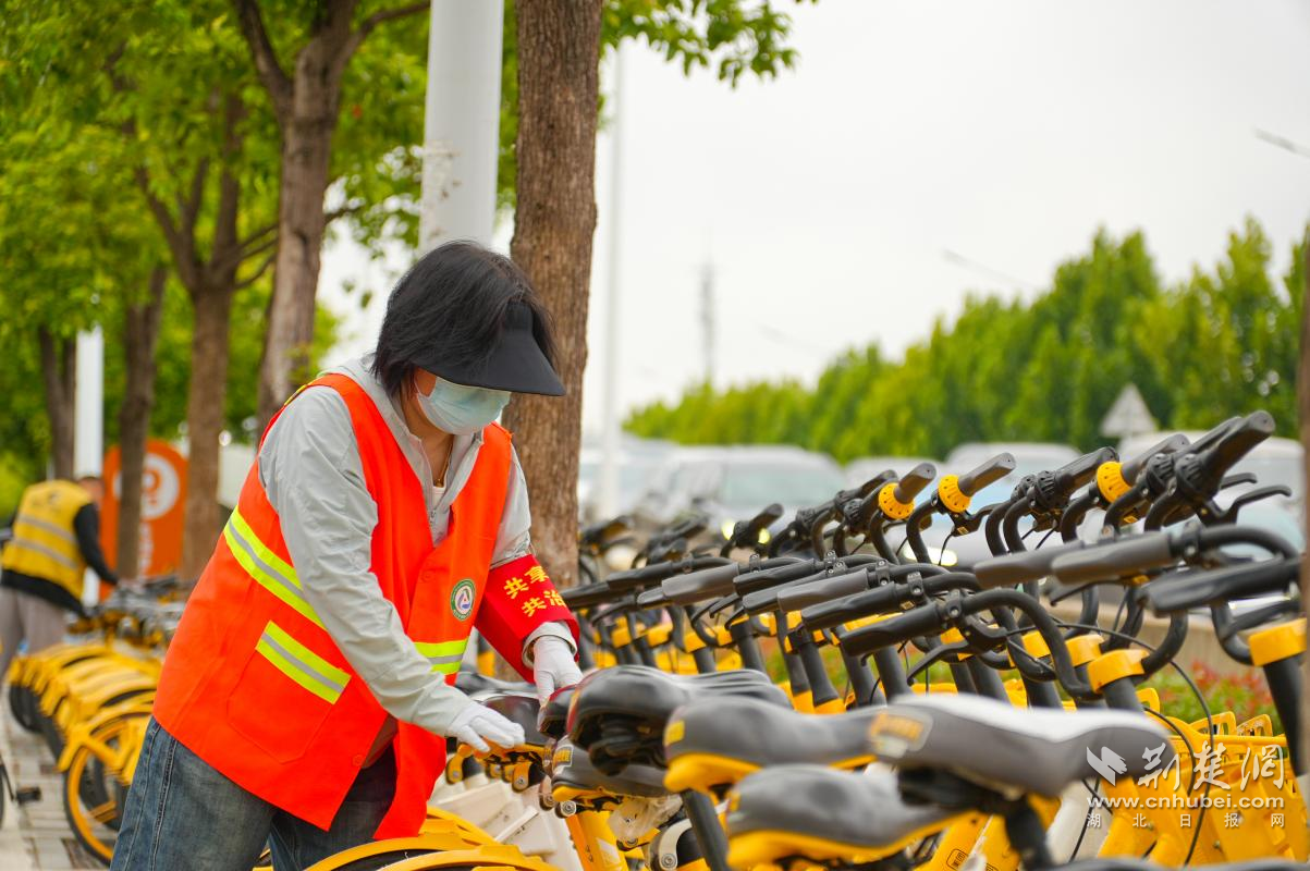 武漢輕工大學(xué)學(xué)生志愿者參與單車擺放。