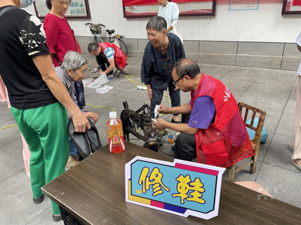 活動現(xiàn)場,磨刀、理發(fā)、修鞋等傳統(tǒng)便民服務(wù)點位前排起長隊。磨刀師傅手持磨刀石,動作嫻熟,“嚓嚓”聲中,一把把刀具煥然一新。理發(fā)師根據(jù)居民需求精心修剪發(fā)型,70歲的王大爺理完發(fā)后對著鏡子贊嘆:“手藝比理發(fā)店還好,還免費(fèi),真是方便!”修鞋攤前,師傅用專業(yè)工具修補(bǔ)鞋履,居民們看著修好的鞋子紛紛豎起大拇指:“這手藝,絕了!”