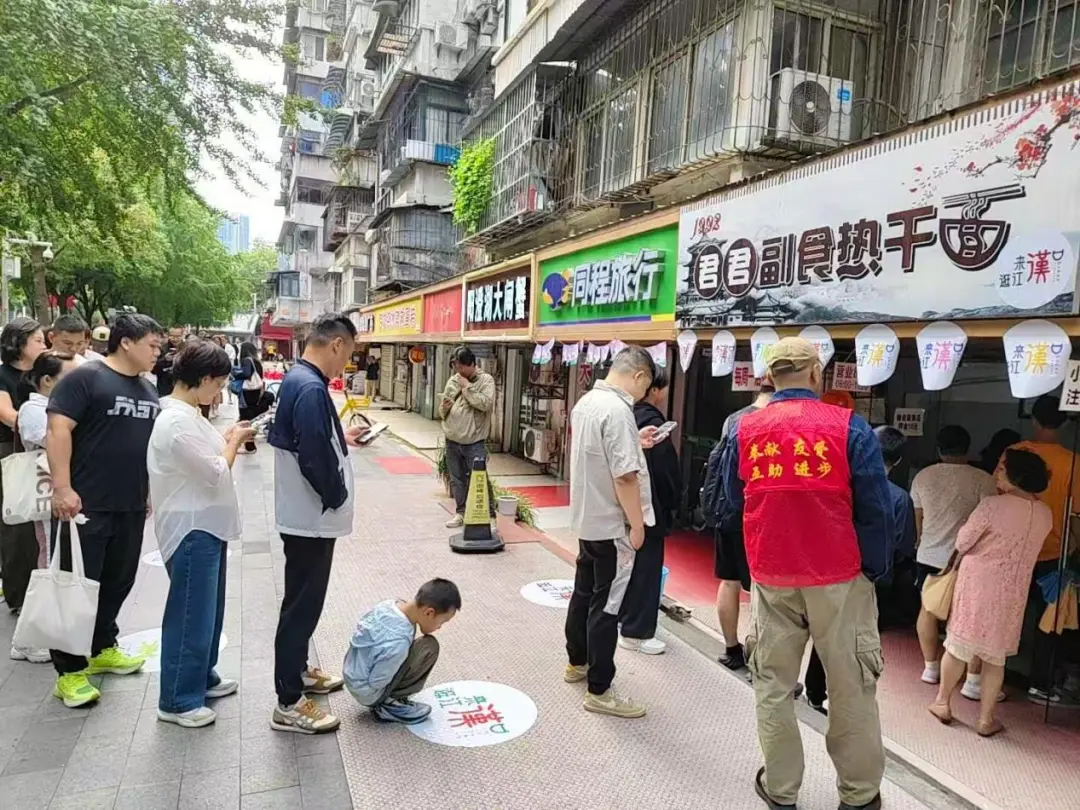 國慶中秋假期,江漢區(qū)游客量激增,君君副食的隊伍從店門口蜿蜒著排出數(shù)十米。社區(qū)志愿者舉著醒目的提示牌引導(dǎo)停車,網(wǎng)格員把路邊的共享單車統(tǒng)一移走,引導(dǎo)著慕名而來的食客井然有序地排隊等候?!耙郧耙坏焦?jié)假日就發(fā)愁,客人擠得轉(zhuǎn)不開身,現(xiàn)在有專人維持秩序,生意反而更穩(wěn)當了。”店主余阿姨擦著額頭的汗笑言。