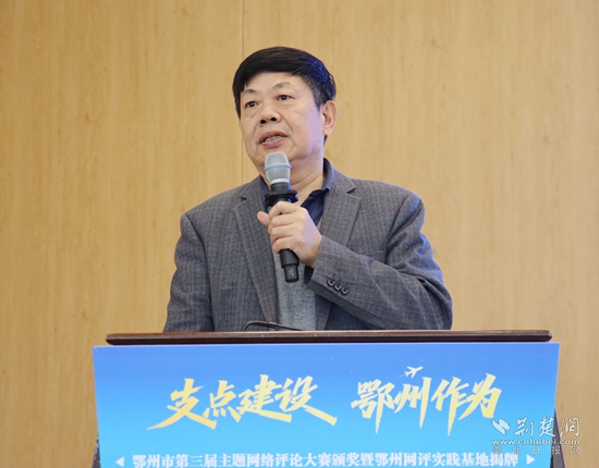 頒獎(jiǎng)活動(dòng)現(xiàn)場(chǎng),湖北省社會(huì)科學(xué)院原副院長(zhǎng)、省政府咨詢委員、長(zhǎng)江經(jīng)濟(jì)帶智庫聯(lián)盟秘書長(zhǎng)秦尊文受邀出席,并從網(wǎng)評(píng)的角度,圍繞“弘揚(yáng)花湖精神 助力支點(diǎn)建設(shè)”主題,發(fā)表了主旨演講。他結(jié)合最新公布的《中共中央關(guān)于制定國(guó)民經(jīng)濟(jì)和社會(huì)發(fā)展第十五個(gè)五年規(guī)劃的建議》,高屋建瓴分析了鄂州當(dāng)前的經(jīng)濟(jì)形勢(shì),提出了切實(shí)可行的建議。湖北省委直屬機(jī)關(guān)工委干部馮歡以中央網(wǎng)信辦網(wǎng)絡(luò)評(píng)論“創(chuàng)四優(yōu)”競(jìng)賽獲獎(jiǎng)作者身份,分享了自己多年網(wǎng)評(píng)文章寫作的心得體會(huì),風(fēng)趣幽默、干貨滿滿。