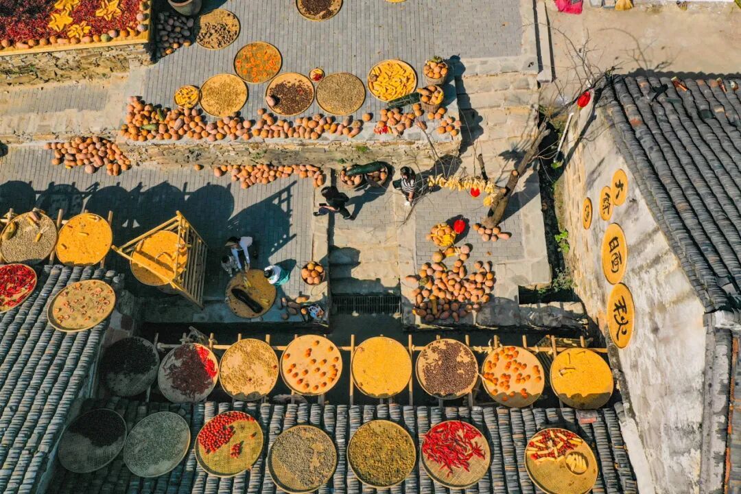 1.古村屋頂平拍農(nóng)作物在陽光下鋪展的鮮活感。