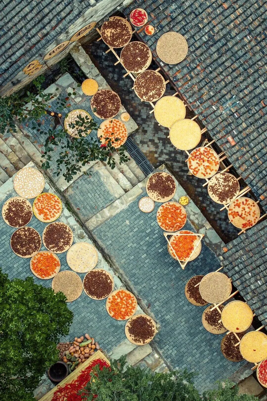 這不是擺設(shè)或表演,是真實(shí)的生活場(chǎng)景。家家戶戶門口擺放的竹匾里,晾曬的是他們一年勞作的收獲。