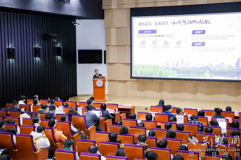 在用人單位推介環(huán)節(jié),武昌區(qū)委常委、組織部部長施國宏以《三生有幸 筑夢江城》為題,從“歷史底蘊”“現(xiàn)代產(chǎn)業(yè)”和“生態(tài)宜居”等維度,介紹了武昌作為武漢重要城區(qū)的獨特魅力——從黃鶴樓的千年文化到長江沿岸的現(xiàn)代樓宇經(jīng)濟,從東湖綠道的生態(tài)長廊到“環(huán)沙湖經(jīng)濟帶”的創(chuàng)新活力,一個開放包容、充滿機遇的武昌形象吸引了在場眾多學子。