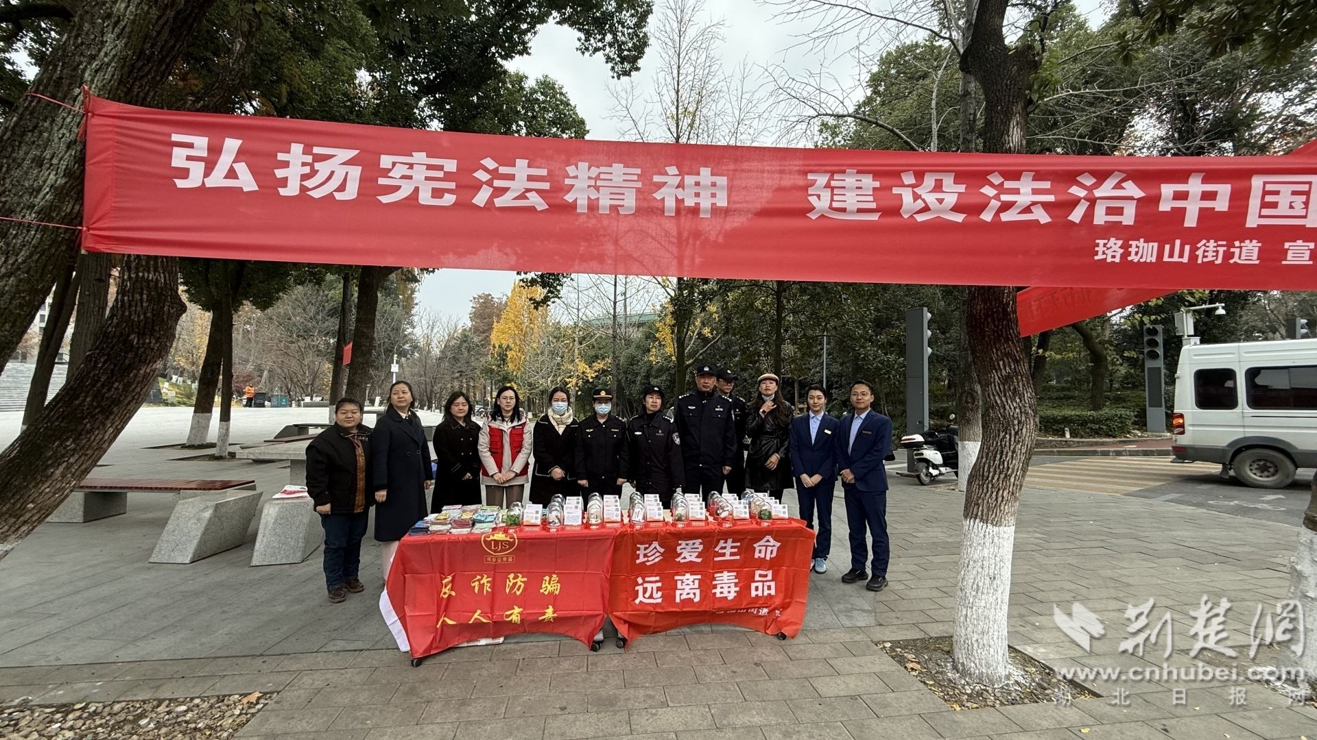 荊楚網(wǎng)(湖北日?qǐng)?bào)網(wǎng))訊(通訊員 方茜)12月4日,武昌區(qū)珞珈山街道聯(lián)合武漢大學(xué)保衛(wèi)部、轄區(qū)派出所、司法所、執(zhí)法隊(duì)等多部門,在武漢大學(xué)萬林藝術(shù)博物館門前舉辦“憲法宣傳周”暨國家憲法日集中宣傳活動(dòng)。本次活動(dòng)以“憲法守護(hù)健康權(quán),禁毒筑牢生命線”為主題,旨在弘揚(yáng)憲法精神,增強(qiáng)全民法治觀念,同時(shí)深化禁毒宣傳教育,筑牢校園與社會(huì)禁毒防線。