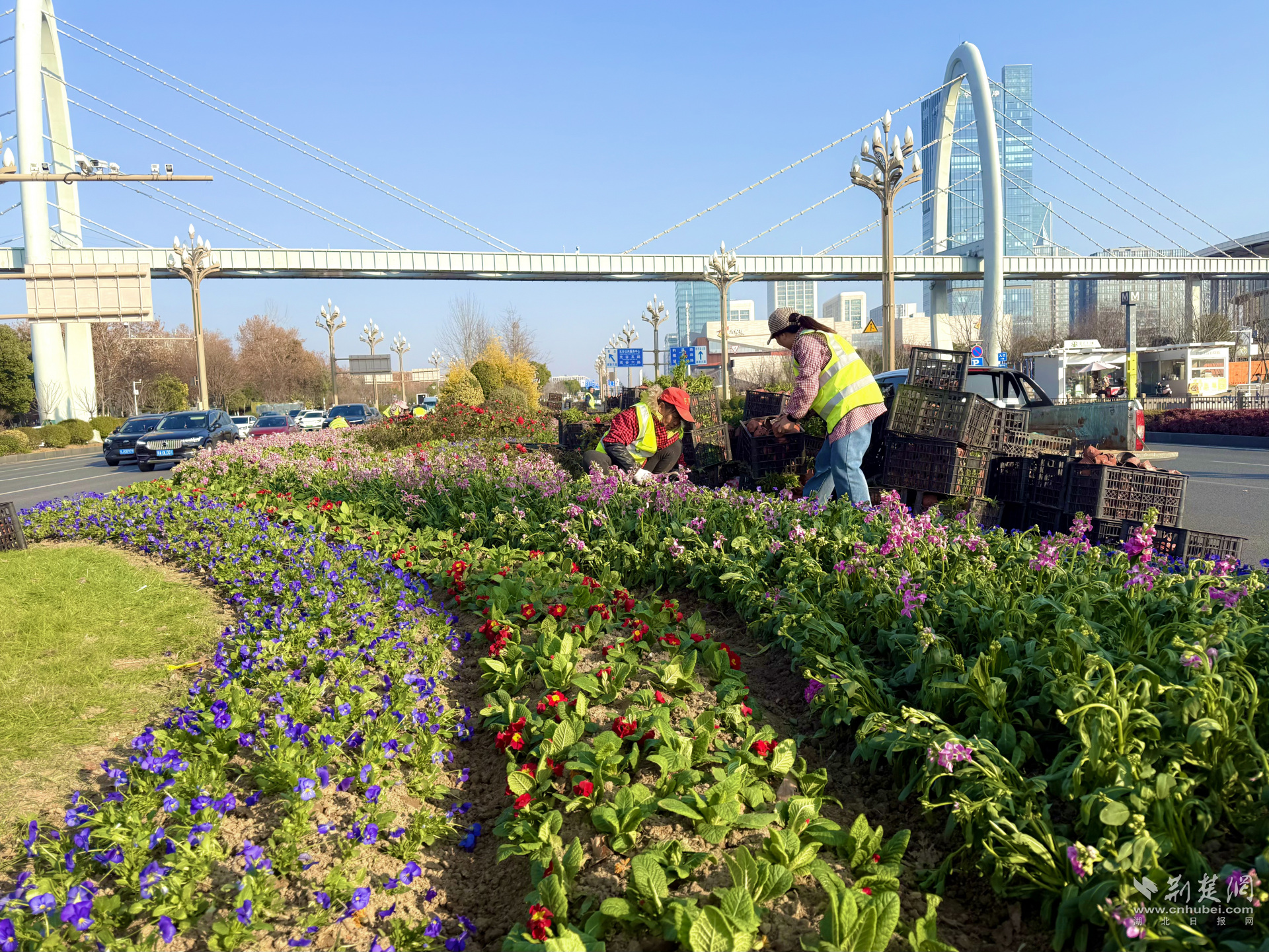 在城市主干道和重要節(jié)點,節(jié)日花卉景觀已陸續(xù)亮相。高新大道、光谷廣場等核心路段,約7300平方米的三色堇、角堇、石竹等時令花卉集中綻放,色彩層次分明,形成綿延不斷的“城市花帶”。在光谷同濟(jì)醫(yī)院周邊、光谷一路等區(qū)域,600平方米的精致花境點綴街角,與城市空間自然融合,為市民日常出行增添亮色。