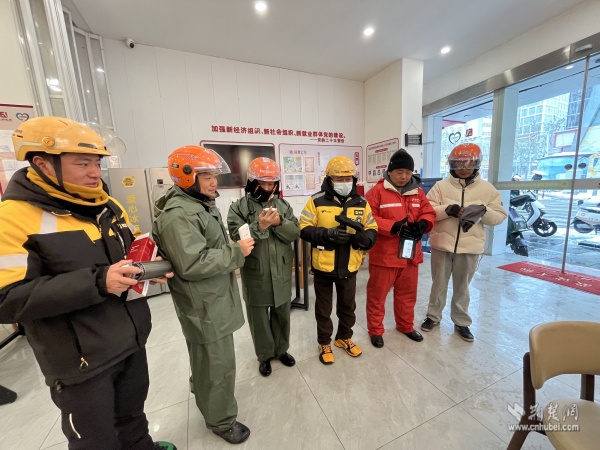 武昌區(qū)總工會維權(quán)服務(wù)部負責人夏巨波與街道工會工作人員一邊分發(fā)慰問物資,一邊與大家親切交談:“雪天路滑,騎車千萬要慢行,安全第一?!薄绑A站里備了熱水和微波爐,累了隨時進來歇腳,別凍著自己。”