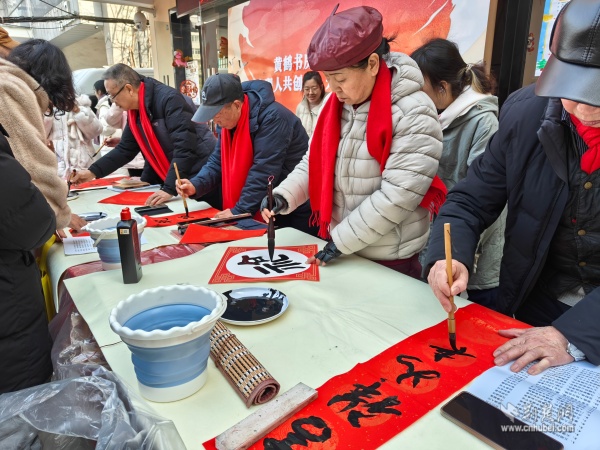 外場體驗區(qū)更是精彩紛呈。在定制春聯(lián)區(qū),95歲高齡的社區(qū)居民黃勁勇老先生帶領(lǐng)首義書畫協(xié)會的老師們現(xiàn)場揮毫,筆走龍蛇。一副副對聯(lián)、一張張福字,承載著真摯祝福與新年期盼,吸引居民有序排隊領(lǐng)取。親子手工區(qū)、便民服務(wù)角與特色年貨市集同樣人氣高漲,居民在參與中感受文化、享受服務(wù)、樂購年貨。
