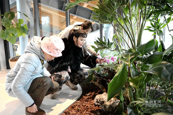 園藝師細(xì)致觀察“花嶼森活”綠色驛站植物搭配巧思。 通訊員供圖
