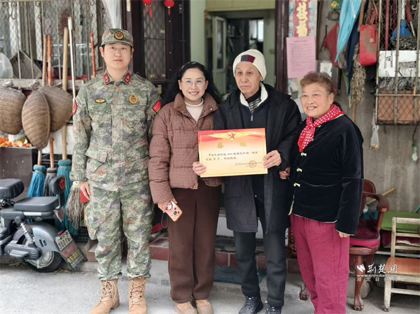 荊楚網(wǎng)(湖北日?qǐng)?bào)網(wǎng))訊(通訊員 蘇楚雄 鐘霓 游薇 侯本瑞)1月29日,武昌區(qū)楊園街道電力新村社區(qū)鑼鼓聲響、熱鬧非凡。街道人武部、退役軍人服務(wù)站和社區(qū)工作人員組成“報(bào)喜小隊(duì)”為現(xiàn)役軍人家屬送去子女在部隊(duì)榮獲的“四有”優(yōu)秀學(xué)員榮譽(yù)證書,并送上慰問(wèn)物資,傳遞對(duì)軍屬的崇高敬意和誠(chéng)摯關(guān)懷。