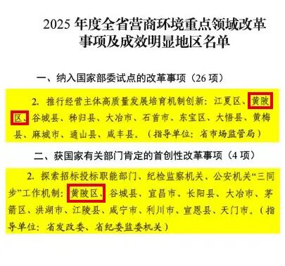 近日,湖北省優(yōu)化營(yíng)商環(huán)境領(lǐng)導(dǎo)小組對(duì)2025年度全省優(yōu)化營(yíng)商環(huán)境重點(diǎn)領(lǐng)域改革事項(xiàng)及成效明顯地區(qū)進(jìn)行通報(bào)表?yè)P(yáng)。其中,黃陂政務(wù)服務(wù)領(lǐng)域兩項(xiàng)創(chuàng)新改革納入國(guó)家部委試點(diǎn),獲國(guó)家有關(guān)部門肯定,彰顯區(qū)域改革擔(dān)當(dāng)與服務(wù)實(shí)力。
