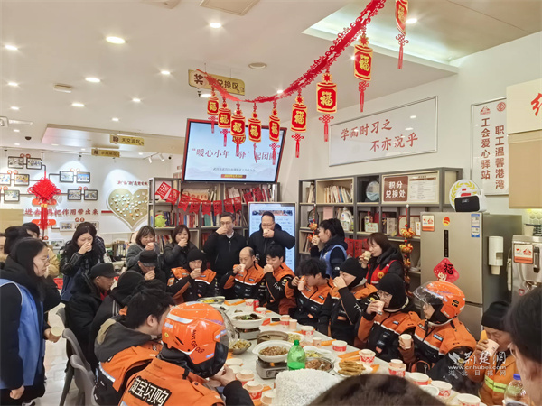 荊楚網(wǎng)(湖北日報網(wǎng))訊(通訊員 趙坤 童霞)2月10日農(nóng)歷小年,武昌區(qū)南湖街道工會聯(lián)合中央花園社區(qū)、寶安社區(qū)在南湖街新就業(yè)群體服務(wù)工會驛站開展“暖心小年,‘驛’起團圓”活動,邀請外賣小哥、快遞員、環(huán)衛(wèi)工人等20余名戶外勞動者歡聚一堂,寫福字、玩游戲、吃團圓宴,在歡聲笑語中,感受工會“娘家人”的溫暖。