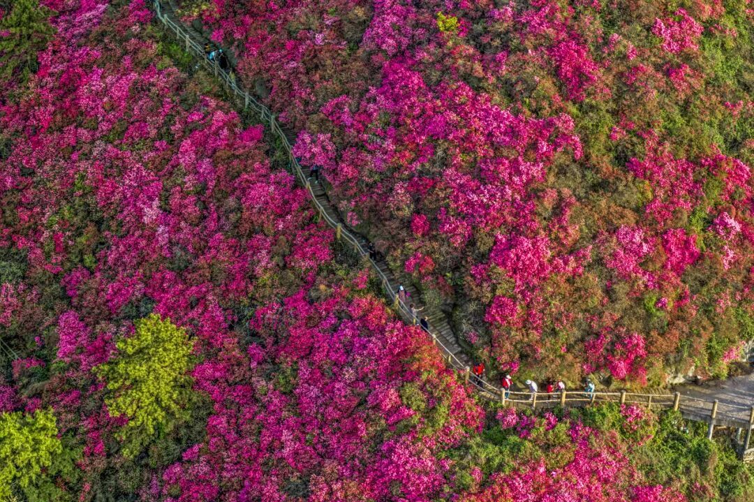 網(wǎng)友@旅行卡妹在攻略中寫道:“云霧山的三座山頭——花宇山、花海、花洋,像是被潑上了紅顏料,漫山遍野像火焰一樣絢爛。”目前,云霧山景區(qū)高海拔區(qū)域的花海依然磅礴。