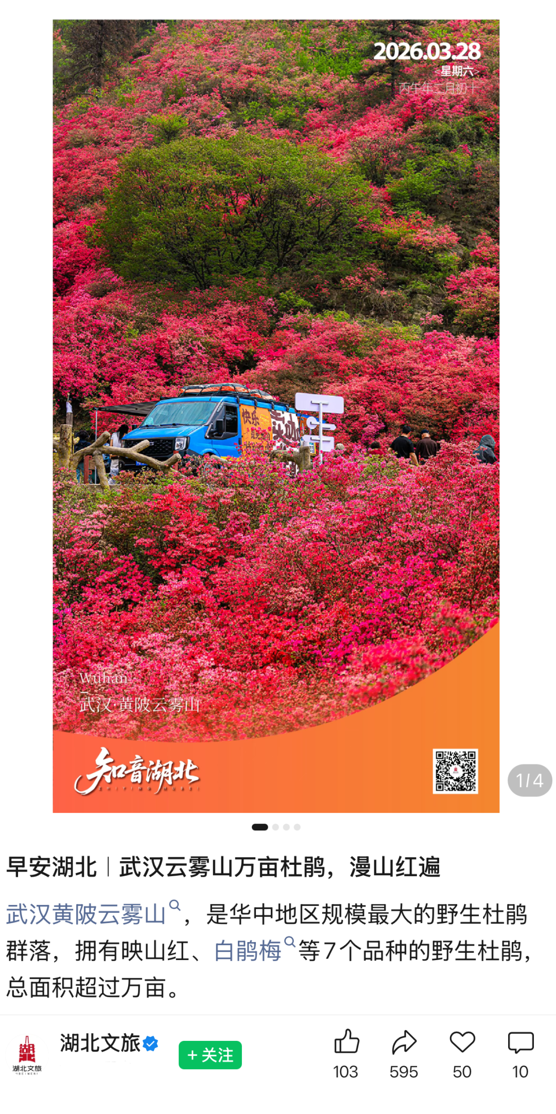 “5點半就起床了,自駕去武漢木蘭云霧山看杜鵑,感覺很值得,明年還要去!”北京游客默默在社交媒體上放出大量木蘭云霧山的美照,表示“春天一定要去一次木蘭云霧山,3到5月漫山遍野的映山紅盛開,真的美到失語。”