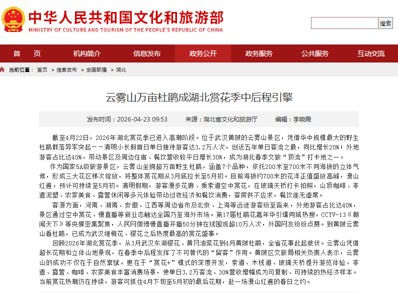 當(dāng)前賞花熱潮仍在持續(xù),游客可抓住4月下旬至5月初的最后花期,赴一場漫山紅遍的春日之約。