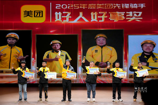 2025年11月,司照天(左三)獲得美團2025年度先鋒騎手稱號。 攝影:劉沖