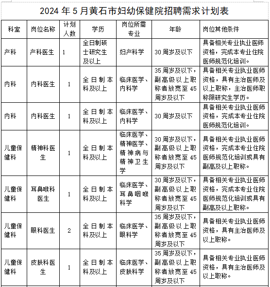 荊楚網(wǎng)(湖北日報(bào)網(wǎng))訊(記者 謝龍飛)近日,黃石市婦幼保健院發(fā)布2024年5月招聘聘用制工作人員公告,將招聘18名聘用制工作人員,涵蓋產(chǎn)科醫(yī)生、內(nèi)科醫(yī)生、精神科醫(yī)生、兒科醫(yī)生等,具體崗位詳見下表。