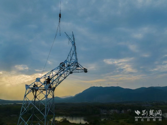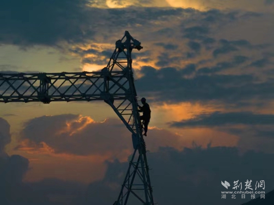 當(dāng)天下午6點(diǎn),夕陽(yáng)染紅了天際。在斜輝映照下,4名電力工人挺立在鐵塔上,準(zhǔn)備最后的螺栓緊固工作。