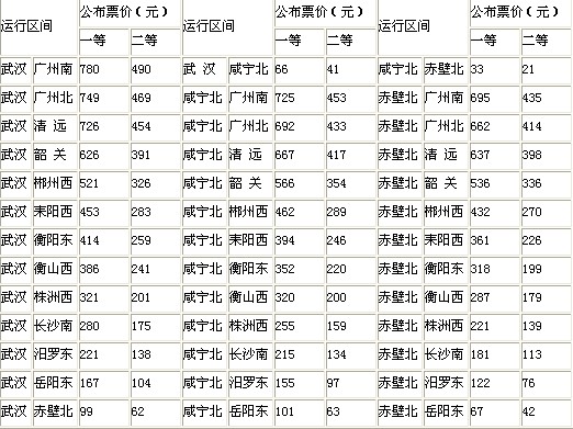 武廣客專高速動(dòng)車組列車票價(jià)表