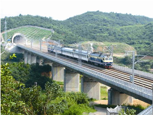 大瑤山位于湘粵交界之處,素有“南嶺險關”之稱。上世紀80年代,修建衡陽到廣州復線,建設者用7年時間在這里修建隧道,全長14公里,是當時國內(nèi)最長的雙線電氣化隧道。這次,武廣客專的方案是修建隧道群,由1號、2號、3號隧道組成,橋隧相連。3條隧道全長25公里,用了3年半全部竣工。