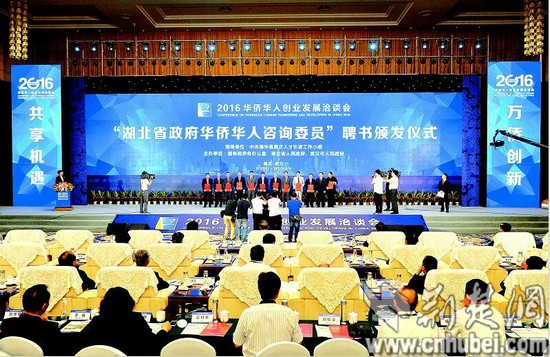圖為:昨日上午,2016年“華創(chuàng)會(huì)”在武漢東湖國(guó)際會(huì)議中心開(kāi)幕。圖為“湖北省政府華僑華人咨詢委員”聘書(shū)頒發(fā)儀式現(xiàn)場(chǎng)。...">